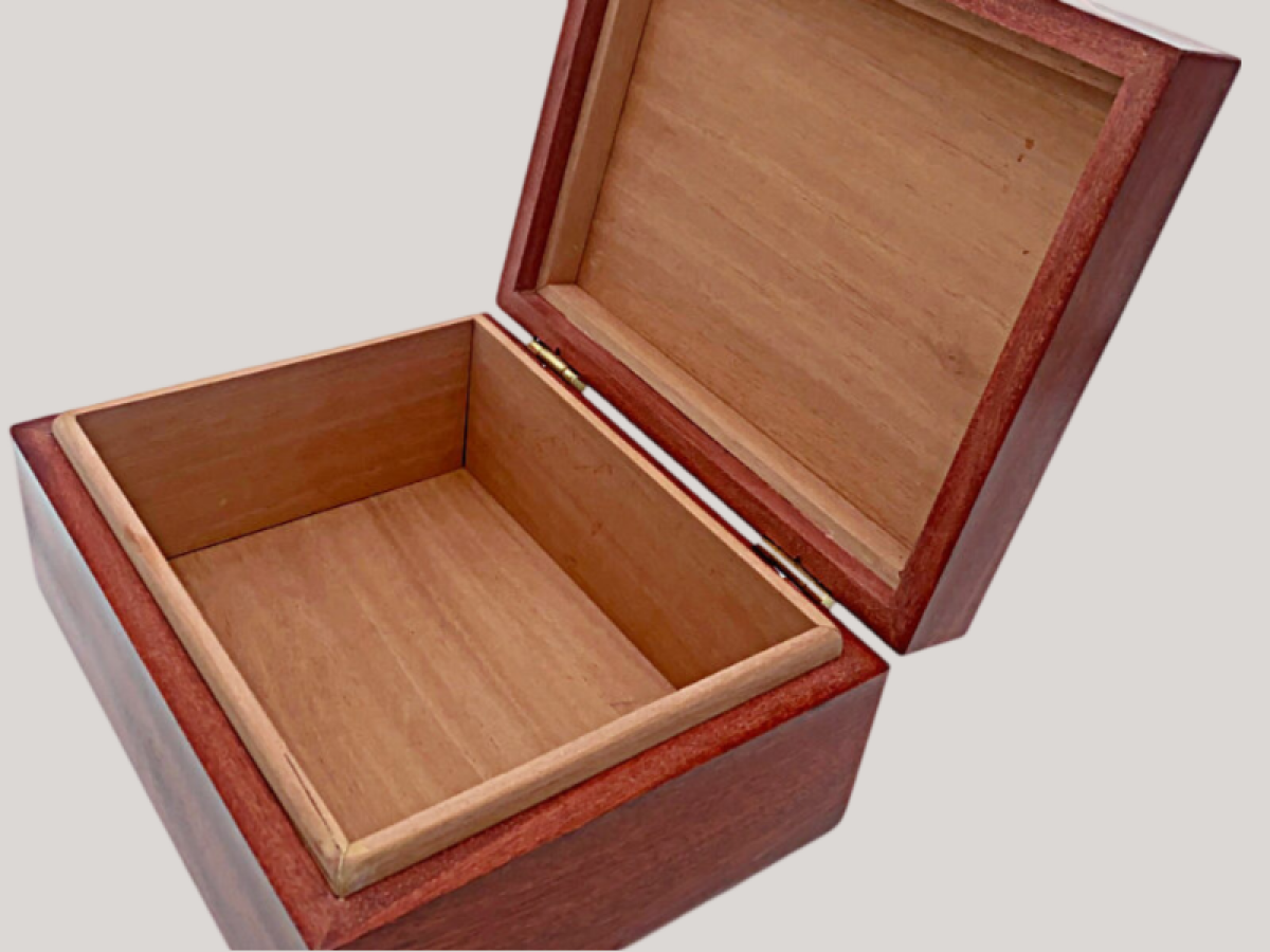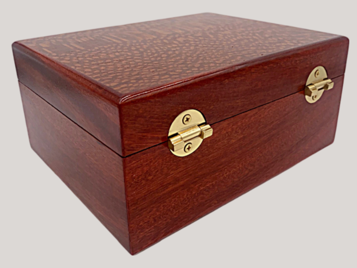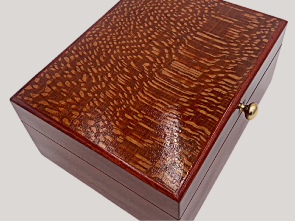 Fancy Blood Wood with Lace wood top, 40-50 cigars. Spanish Cedar lined with solid Brass hardware.