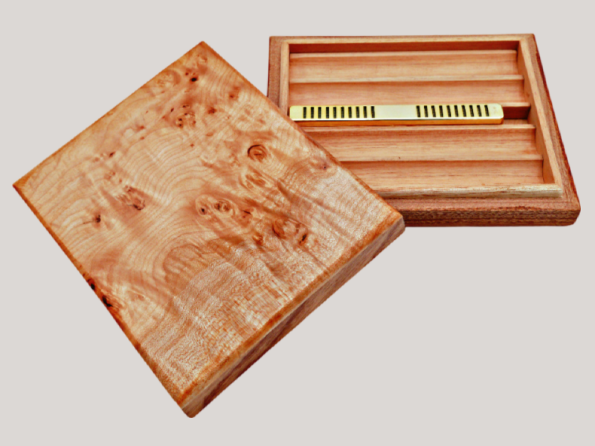 This is a nice piece of Maple Burl on a Mahogany base. Cigars will taste like they are out of your home humidor.