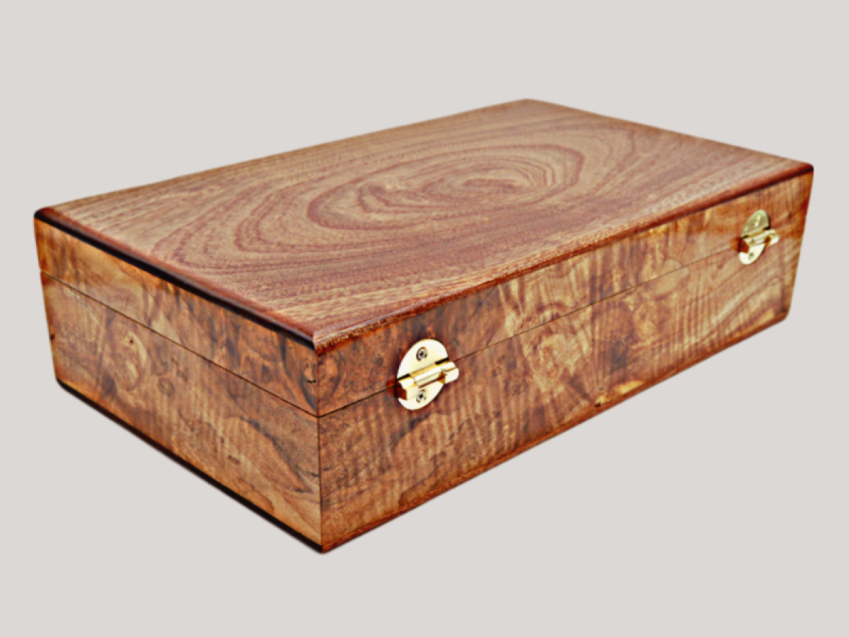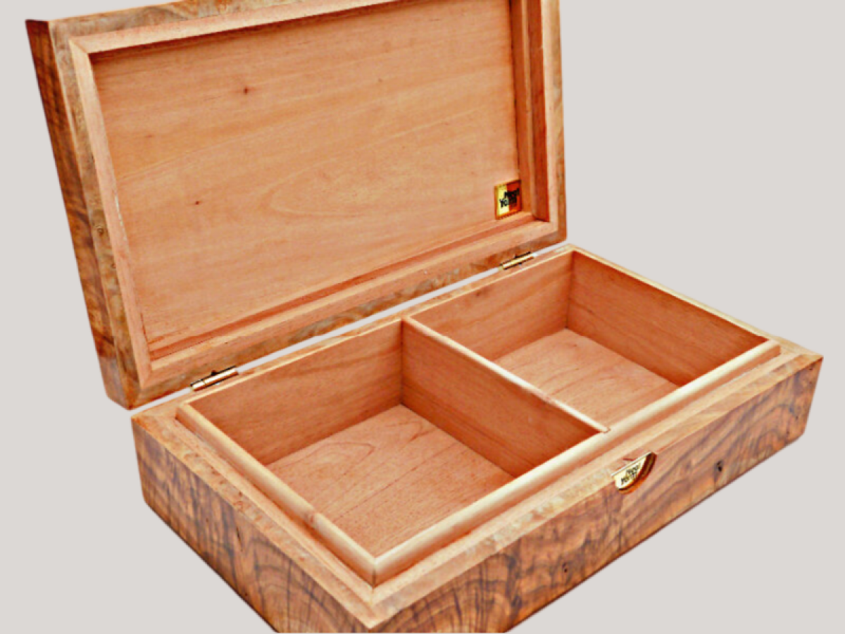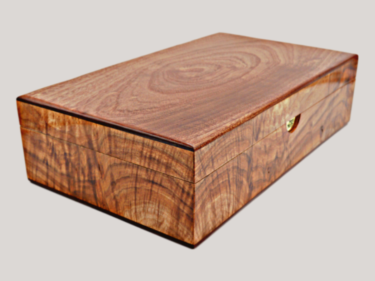 Very exciting Pepper wood base with equally interesting grain Sapele top.Spanish Cedar lined and all Bras hardware.